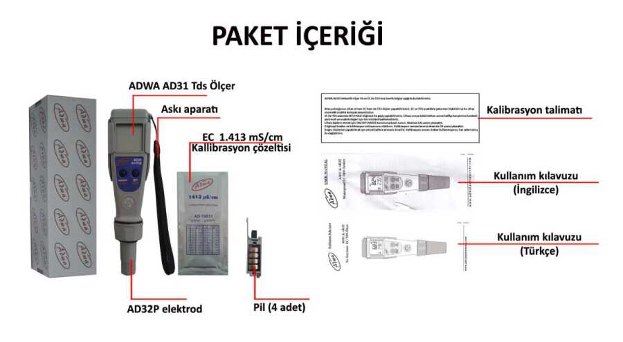 Pakete 20 ml lik kalibrasyon sıvısı dahildir. Prob kısmı su geçirmezdir.