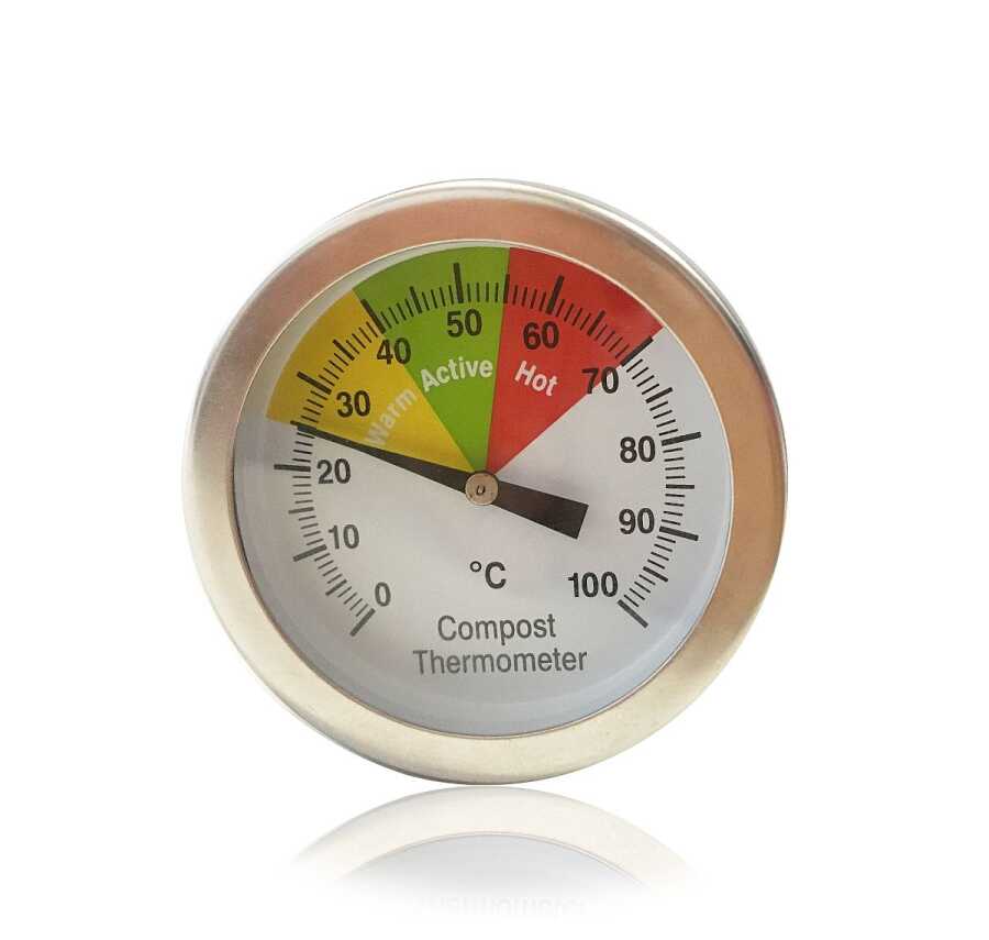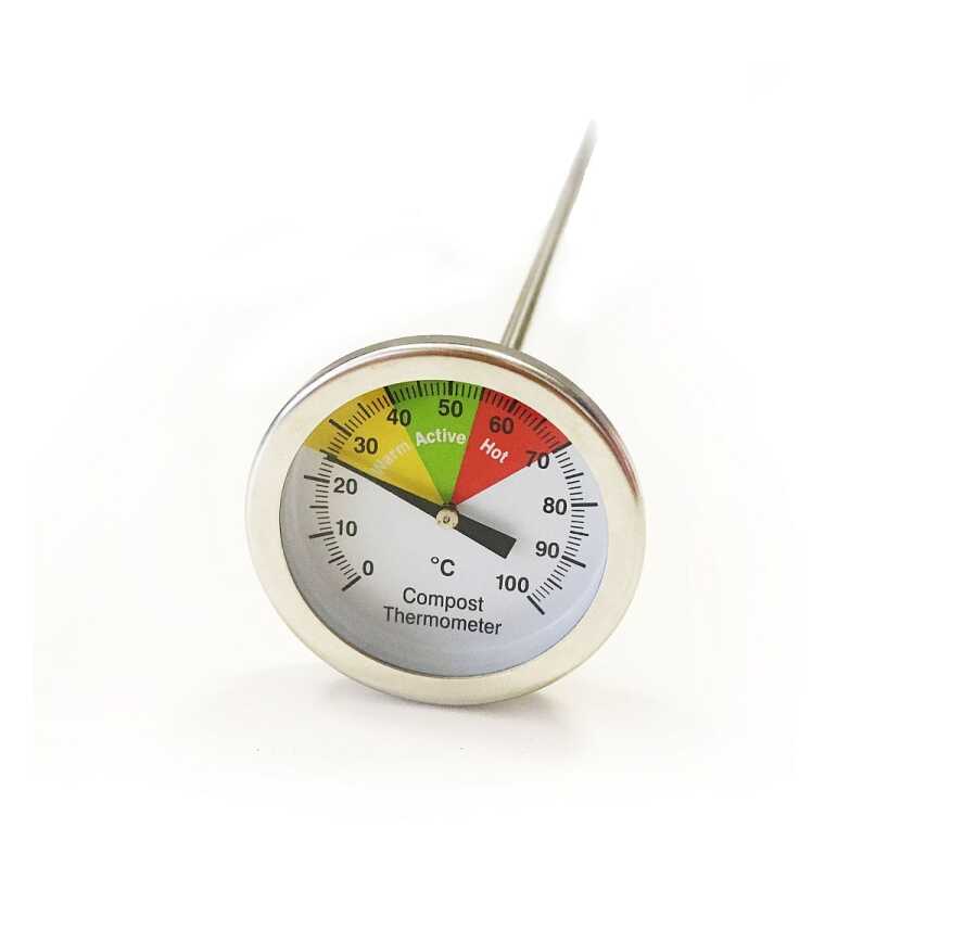 Bu kullanışlı kompost termometresinin 40 cm'lik paslanmaz çelik bir probunu kompost yığınınızın tam ortasına itebilirsiniz