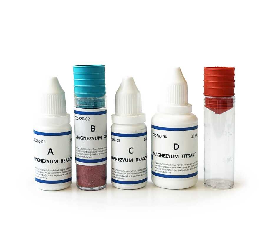 1. Numune kabı ya da deney tüpüne 5 ml örnek alınır. 2. 3 damla Magnezyum-A reagent eklenir. Renk şarap kırmızısı olur. 3. Maviye dönene kadar Magnezyum-D titrant damla damla eklenir ve damla sayısı X olarak kaydedilir. 4. Yeniden 5 ml örnek alınır.¼ mikrokaşık Magnezyum-B powder ve 4 damla Magnezyum-C reagent eklenir ve çalkalanır. Renk pembe olur. 5. Pembe renk mora dönünceye kadar Magnezyum-D Titrant damla damla eklenir ve damla sayısı Y olarak kaydedilir.