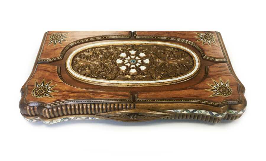 Sedef kakma, bakır ve ahşap mozaik işlemeli