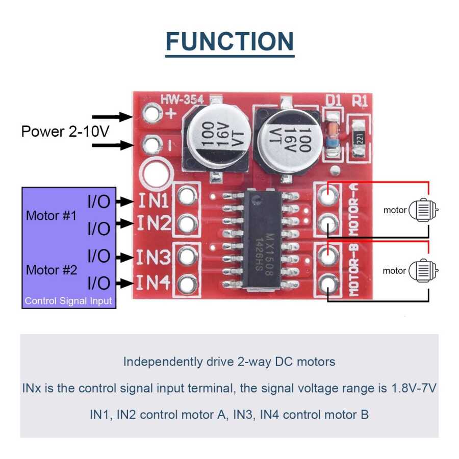 Güç kaynağı voltajı 2V-10V olup, aynı anda iki DC motoru veya bir adet 4 kablolu 2 fazlı step motoru çalıştırabilir