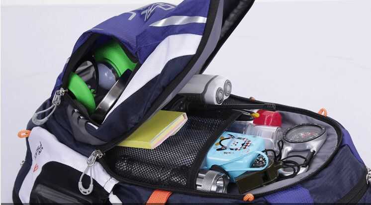 Ön yüzünde bisiklet kaskı taşımak için taşıma filesi takmaya yarayan özel askı aparatları ve altta fileyi koymak için fermuarlı küçük bir cep