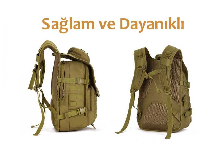 Suya dayanıklı malzemeden yapılmış sağlam yapılı sırt çantası.