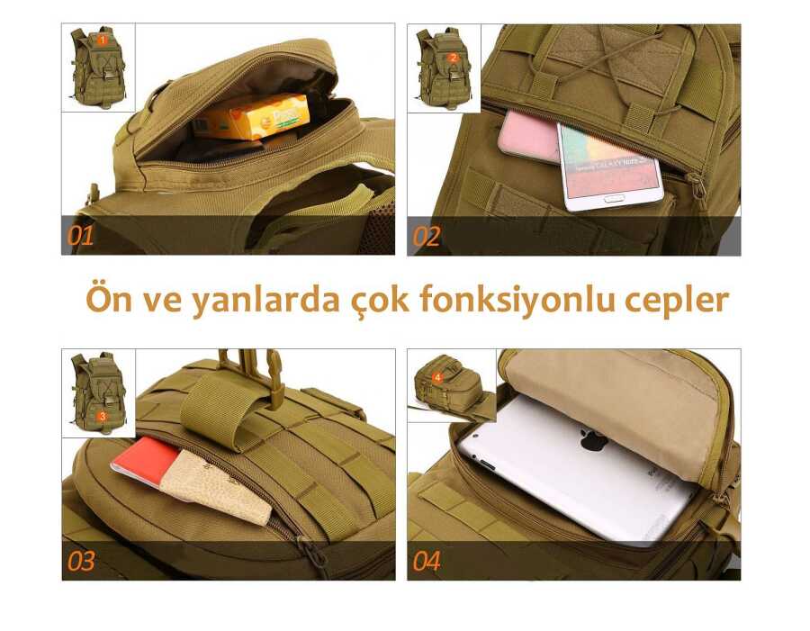 Ön ve yanlarda su geçirmemesi için özel olarak tasarlanmış çok fonksiyonlu cepler