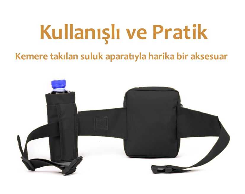 Önde telefonluk olarak da kullanabileceğiniz 2 adet küçük gözü, kolayca erişme imkanı olan fermuarlı bir gözü ve kemere takılan suluk aparatıyla harika bir aksesuar
