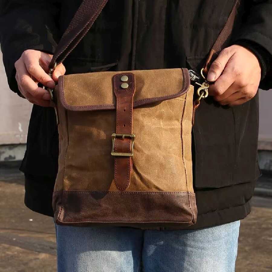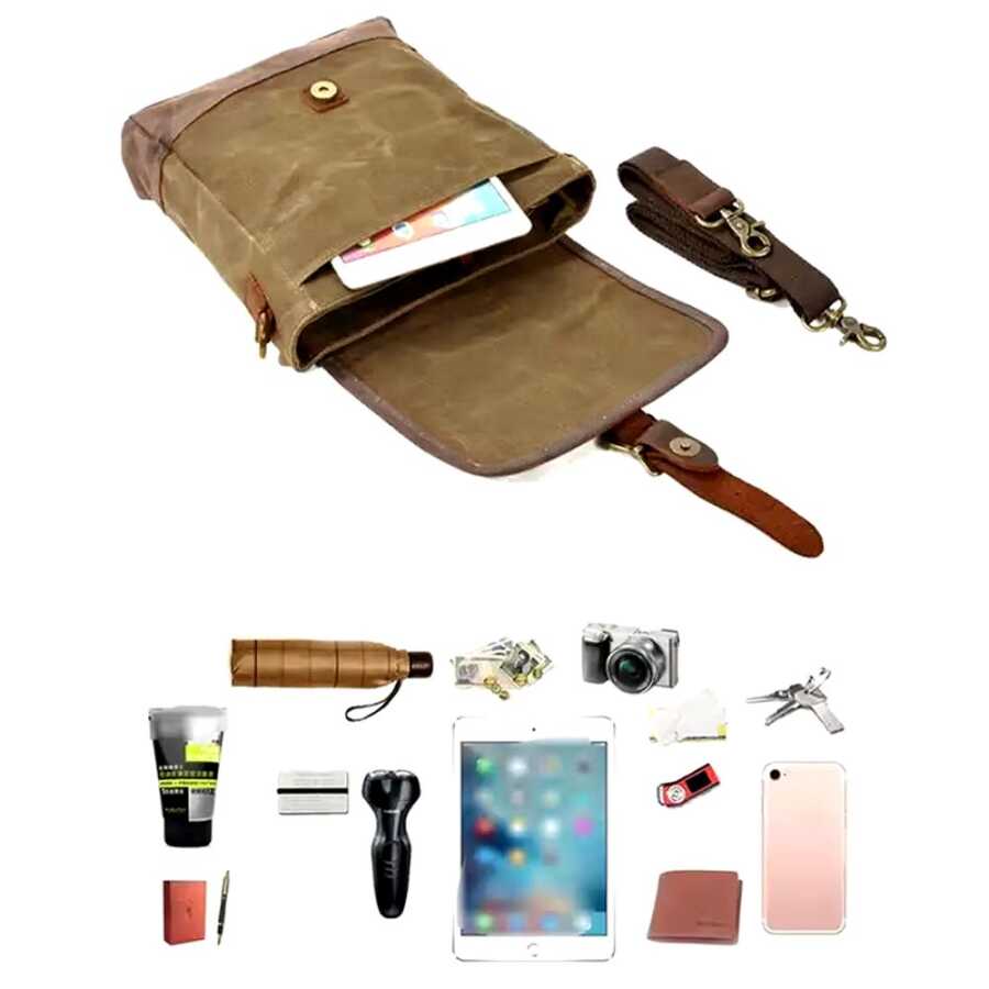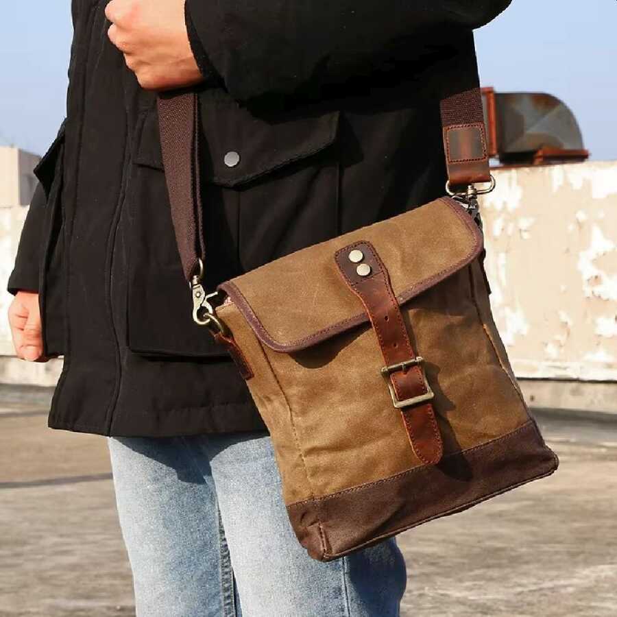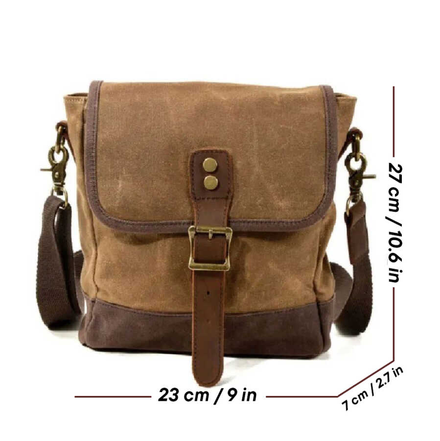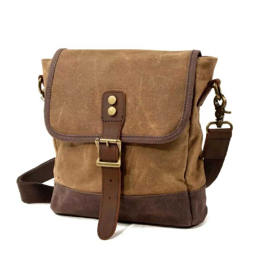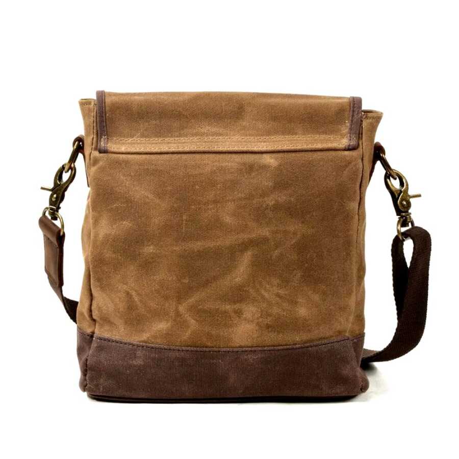 Eskitilmiş mumlu, suya dayanıklı kanvas kumaş ile deri detayları ile son derece şık bir omuz çantası