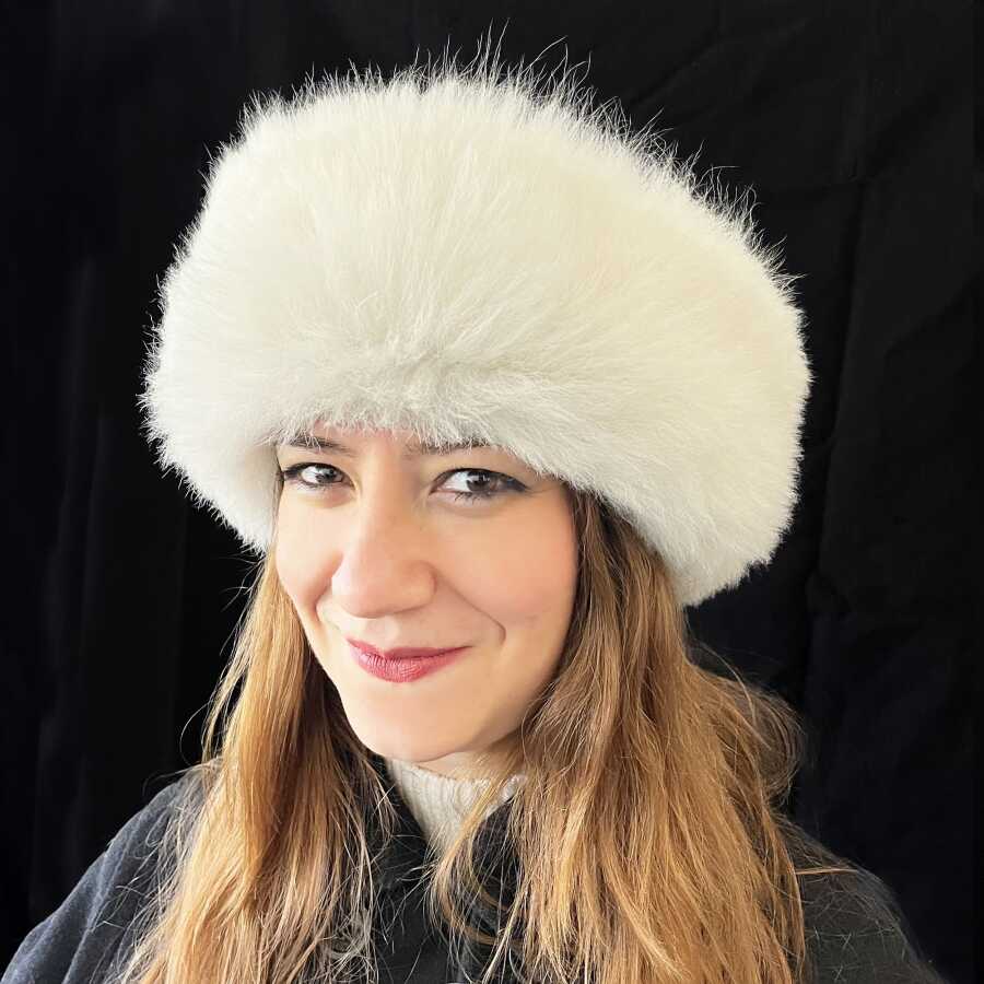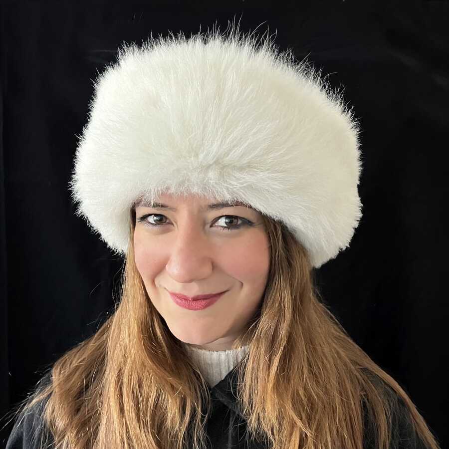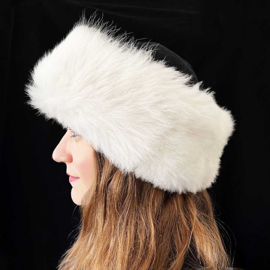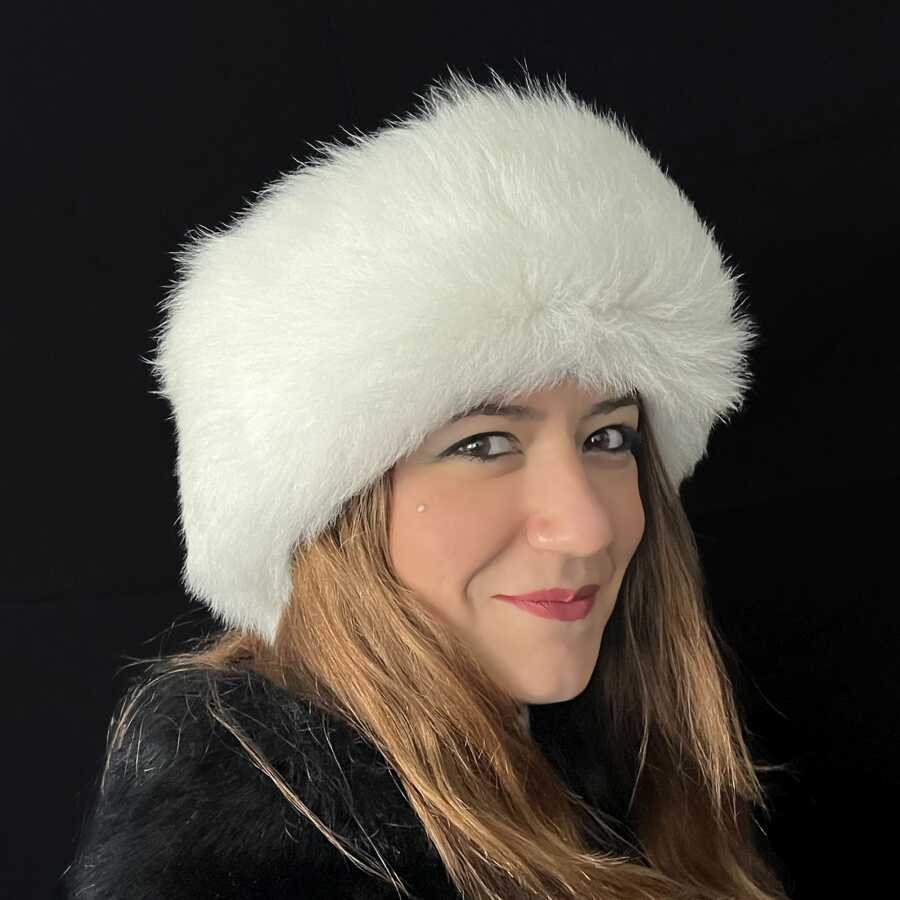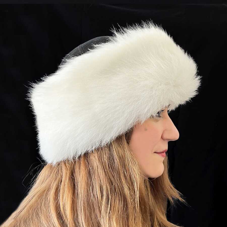 Kaliteli ve şık, el yapımı, beyaz kürklü gerçek deri kadın börk şapka
