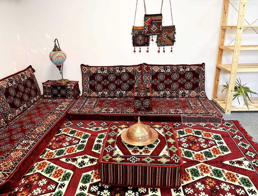 Pamuk - Polyester - PP karışımlı Afgan desen dokumalı ikili sedir takımı.