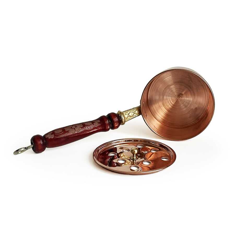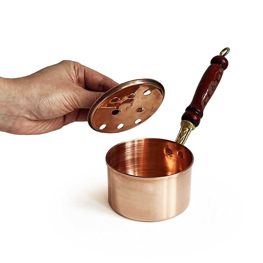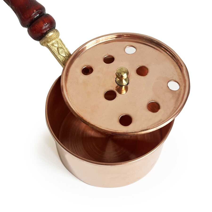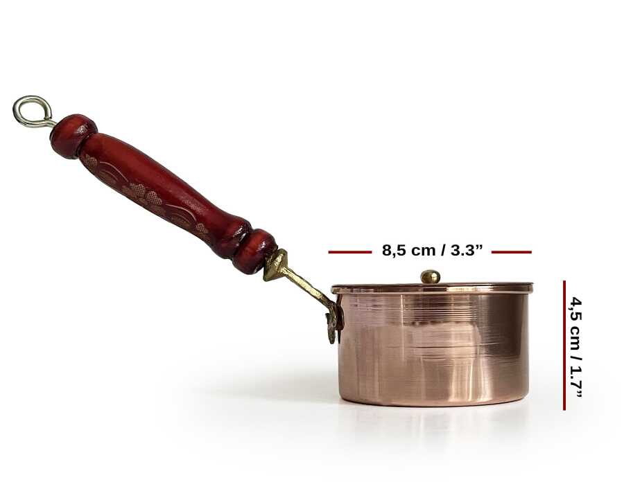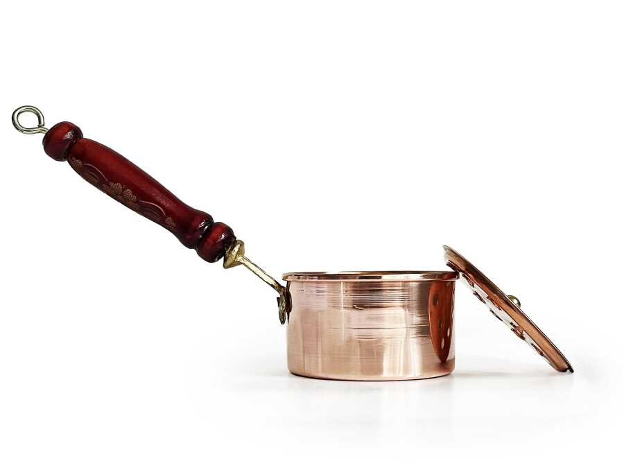 Ahşap sap ve metal kulplu bakır kapağı ile çok şık ve otantik bir tasarım
