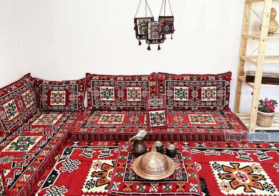 Pamuk - PP - Polyester karışımlı Bergama desen dokumalı ikili sedir takımı kılıfları