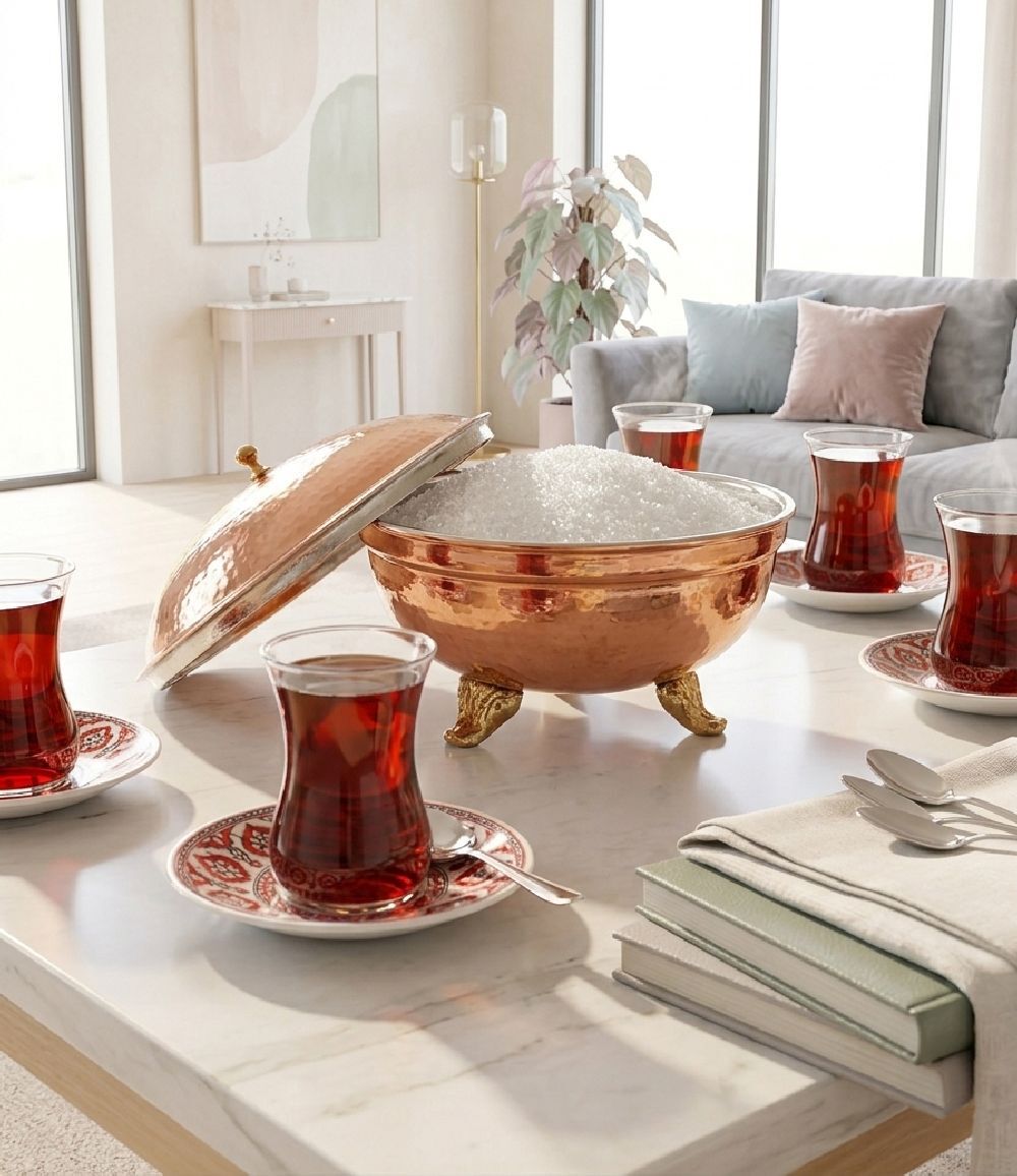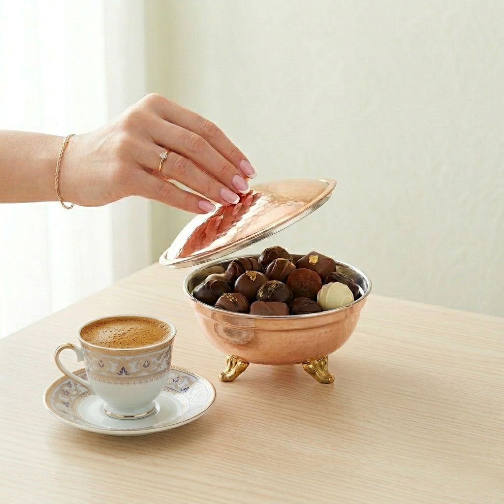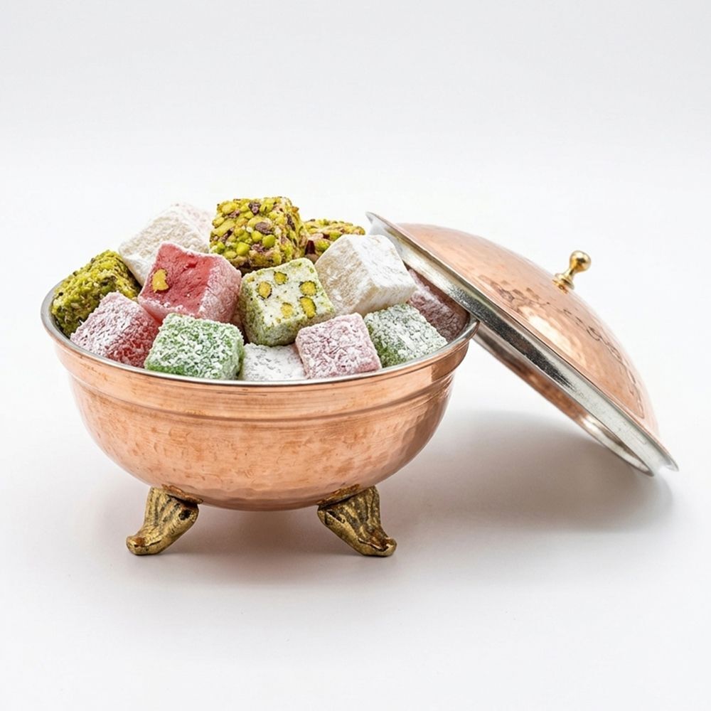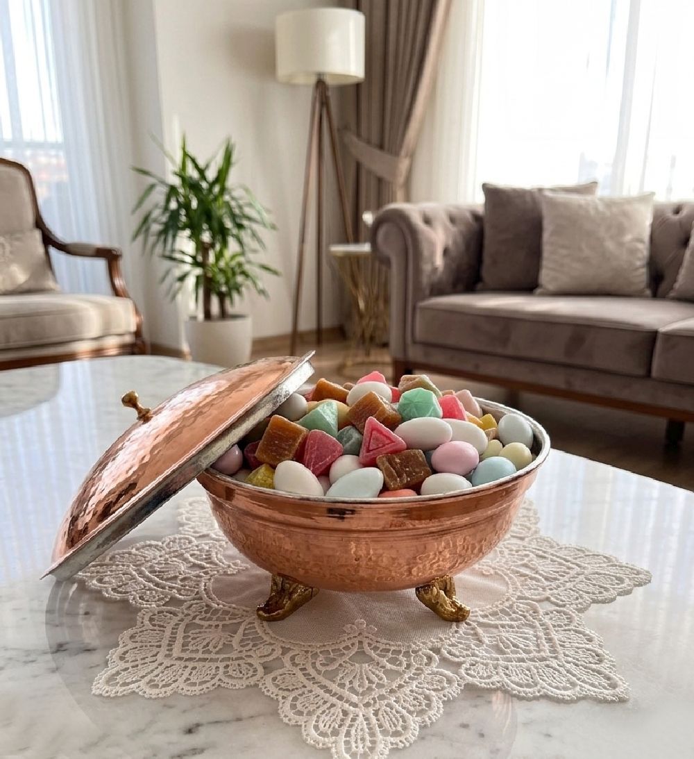 Dayanıklı bakır malzemesi sayesinde uzun ömürlü kullanım sunan ürün, şekerlik olarak kullanımın yanı sıra lokum, çerez ve küçük ikramlıkların sunumu için de uygundur.