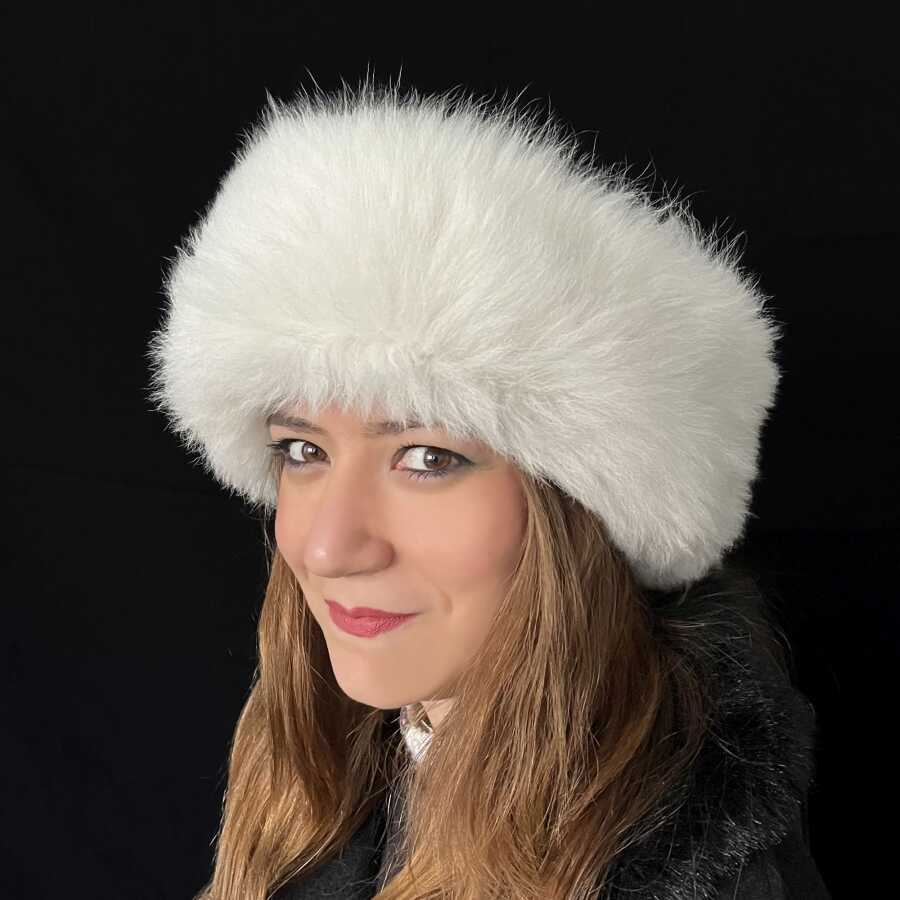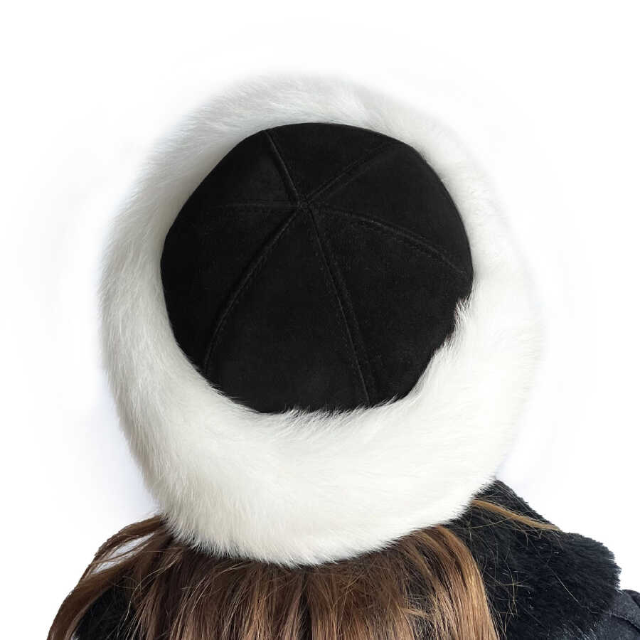 Kaliteli ve şık, el yapımı, beyaz kürklü gerçek deri kadın börk şapka