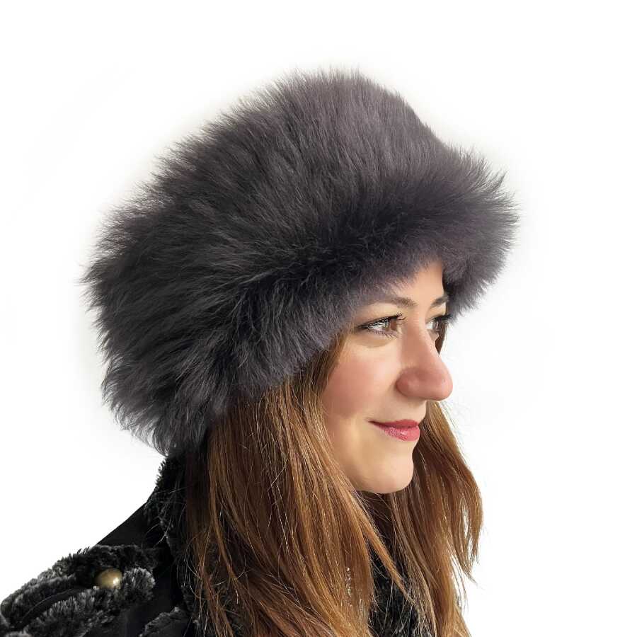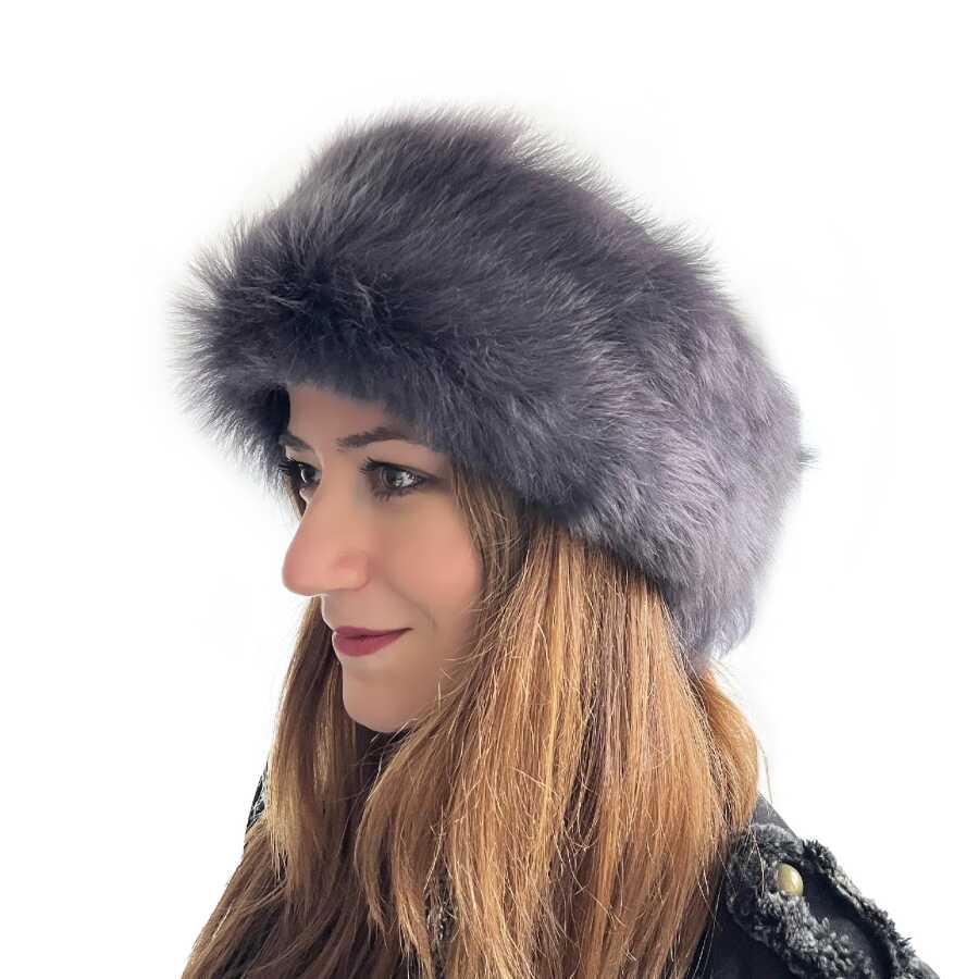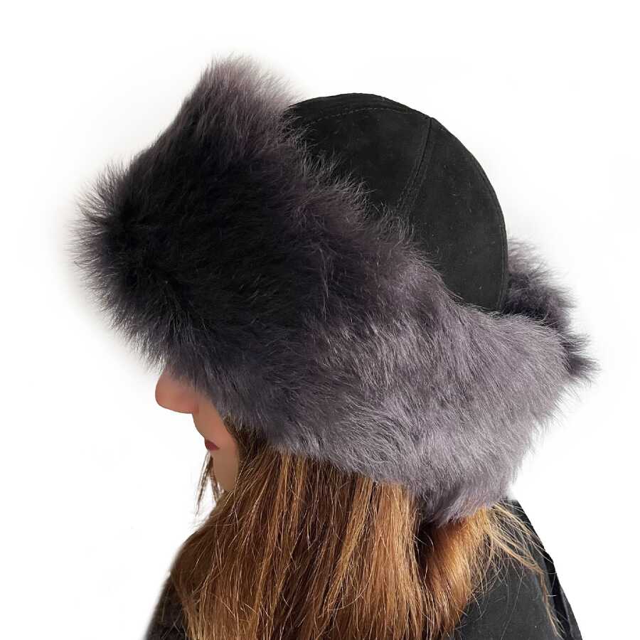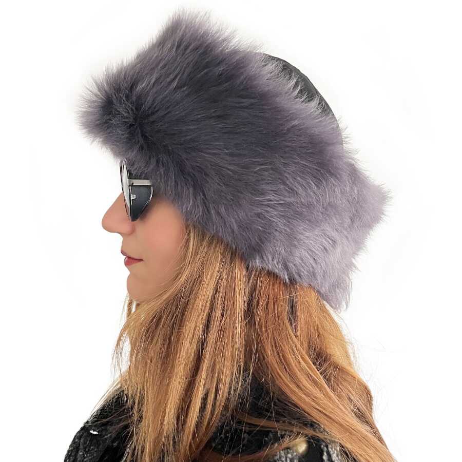 Kaliteli ve şık, el yapımı, gri boz kürklü gerçek deri kadın börk şapka