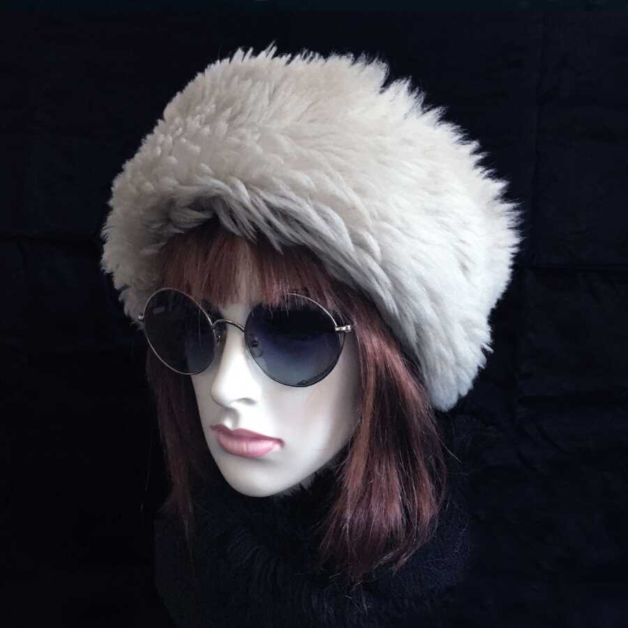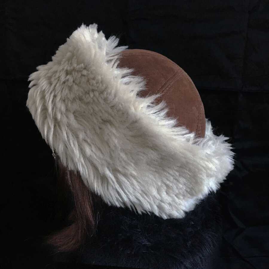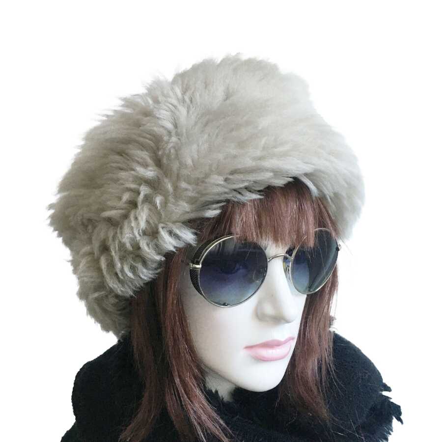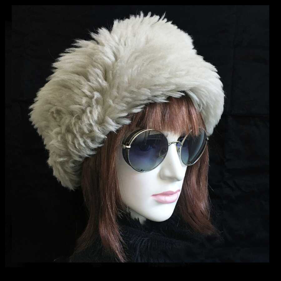 Kaliteli ve şık, el yapımı, kıvırcık bej kürklü gerçek deri kadın börk şapka