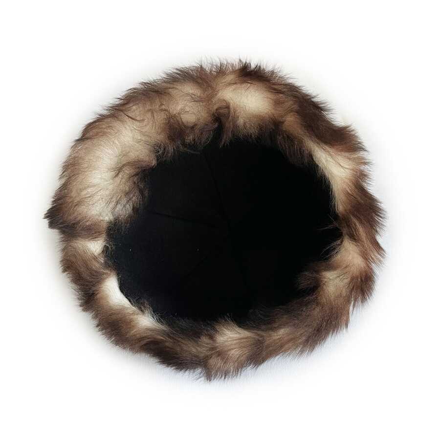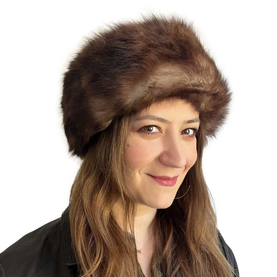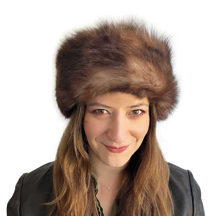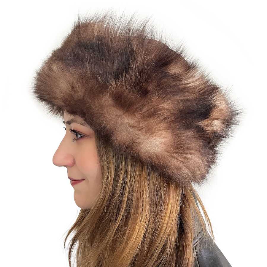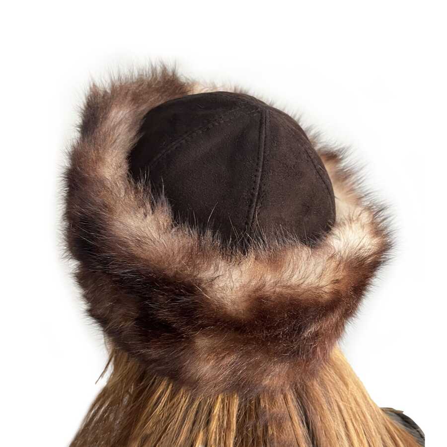 Kaliteli ve şık, el yapımı, koyu kahve kürklü gerçek deri kadın börk şapka