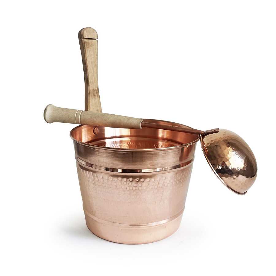 El dövmesi ve el işçiliği ile yapılmış %100 bakır sauna kovası ve kepçe