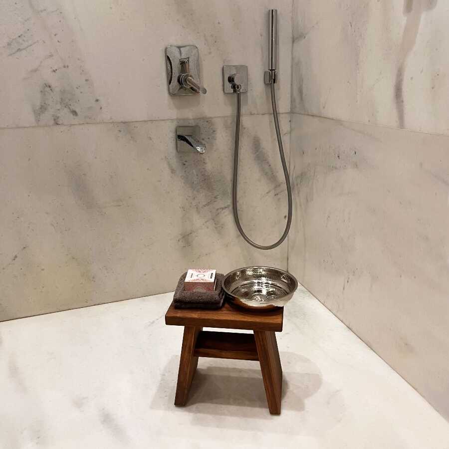 Shark Anatolia İroko Ahşap Banyo Taburesi Oturak ve Beyaz Bakır Hamam Tası Seti