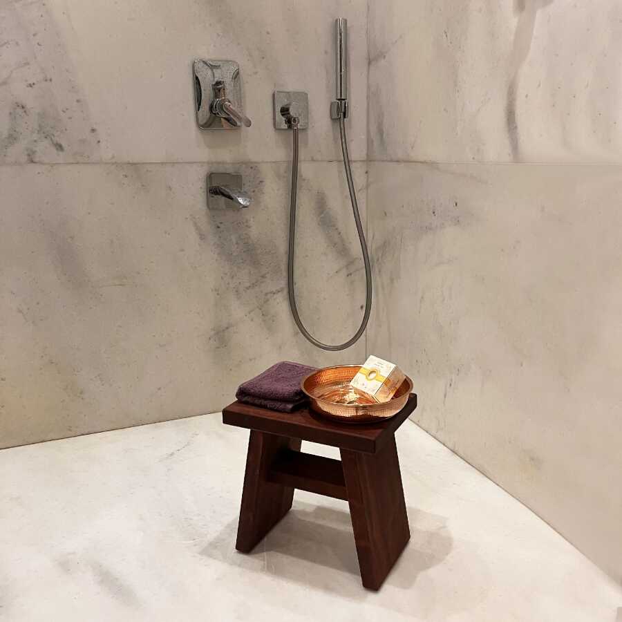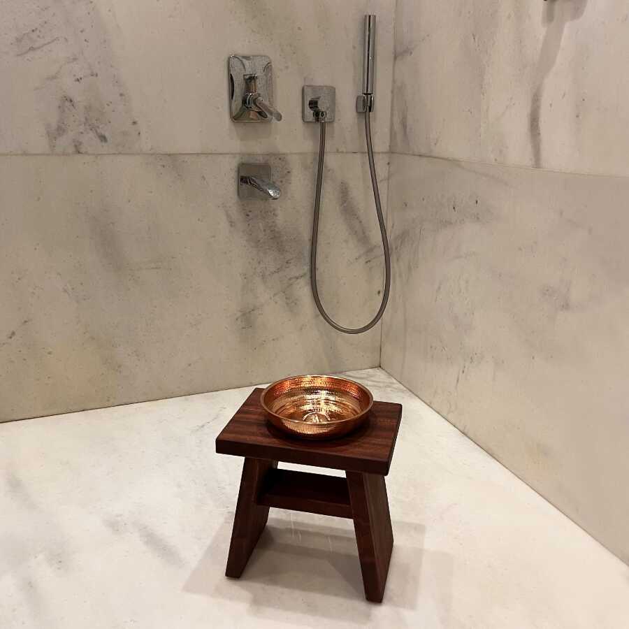 Shark Anatolia Maun Ahşap Banyo Taburesi Oturak ve Kızıl Bakır Hamam Tası Seti