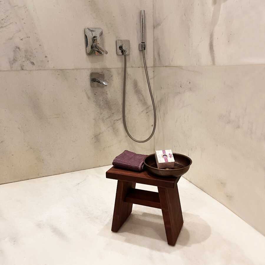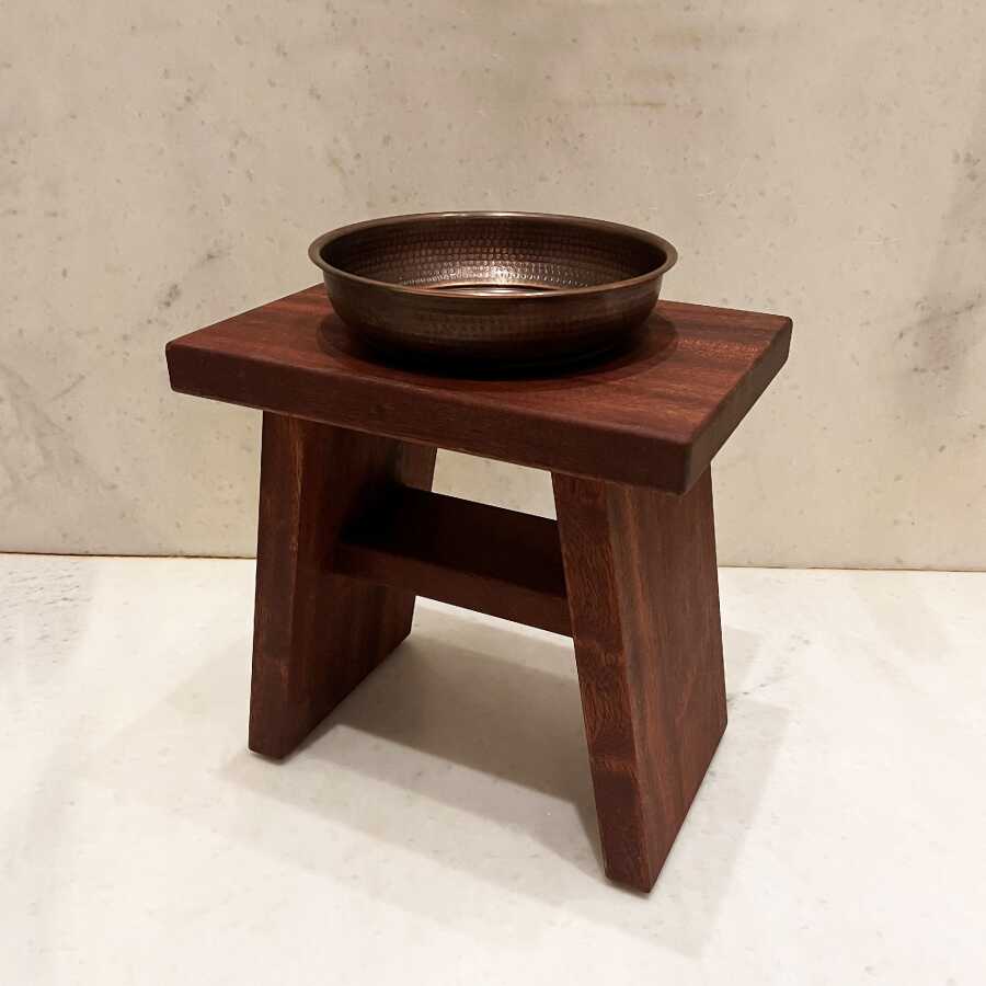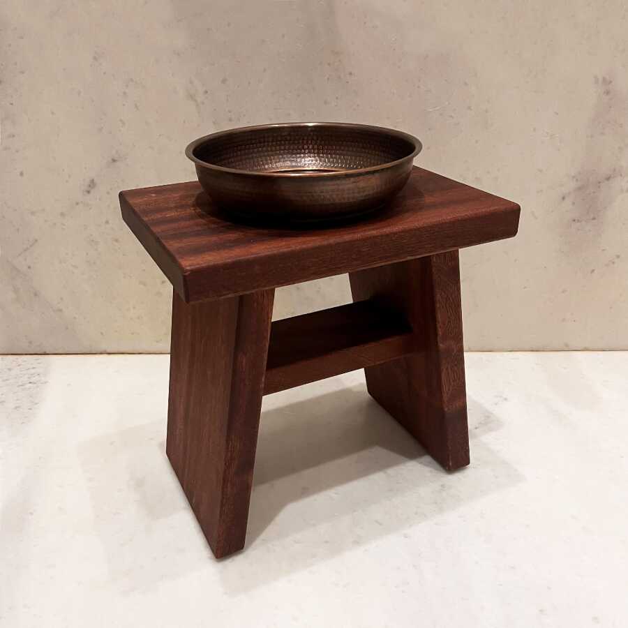 Paket İçeriği: 1 adet Banyo Taburesi (Maun) + 1 adet Bakır Hamam Tası (Oxide) + 1 adet Hediye Havlu ve Sabun