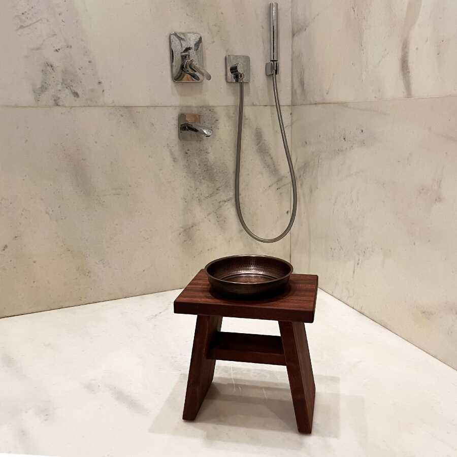 Shark Anatolia Maun Ahşap Banyo Taburesi Oturak ve Oksit Bakır Hamam Tası Seti