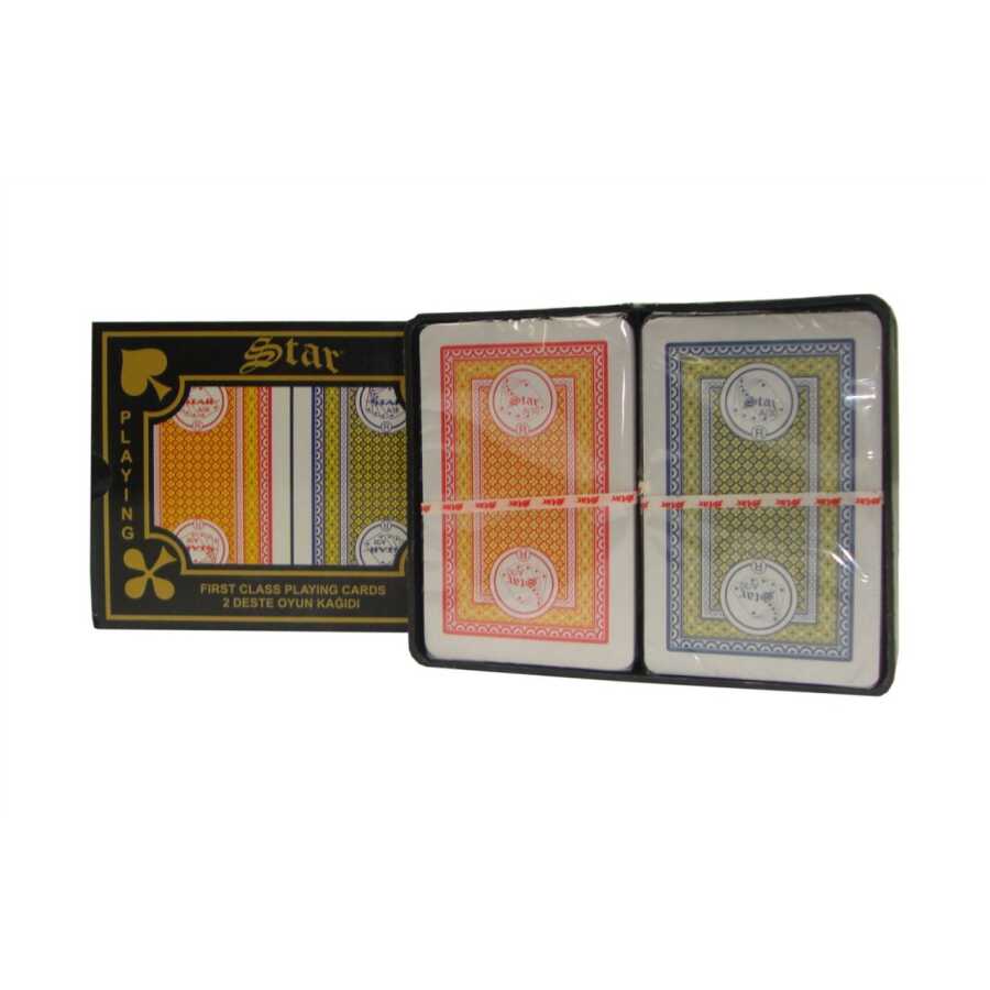 Plastik kutusu içinde, kırmızı ve mavi renklerde 2 deste Star oyun kağıdı