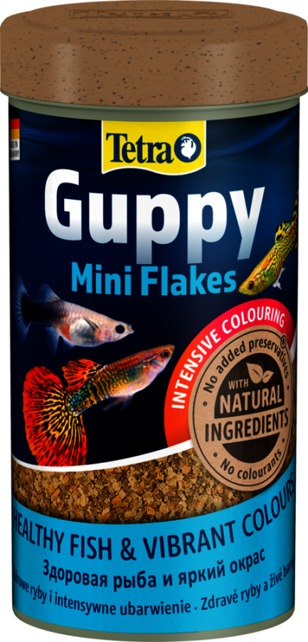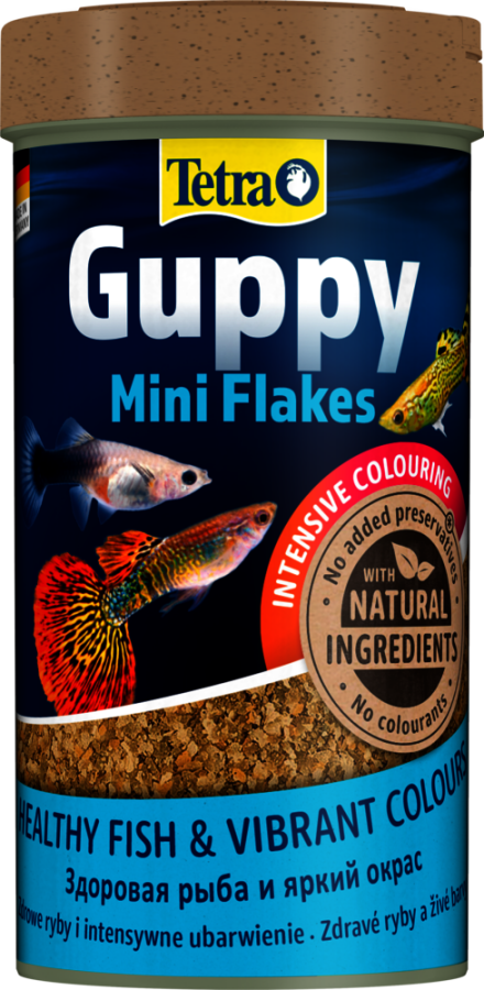 Tetra Guppy Mini Flakes, özellikle lepistes, plati, moli ve kılıçkuyruk gibi canlı doğuran balıklar için formüle edilmiş yüksek kaliteli mini pul yemdir. Dengeli besin içeriği ve bitkisel özlerle zenginleştirilmiş tarif ile balıklarınızın büyümesini, sağlığını ve canlı rengini destekler. Mini pul yapısı, balıkların küçük ağızlarına uygun şekilde tasarlanmıştır ve yüzeyde kısa süre yüzerken doğal beslenme davranışına uygundur.