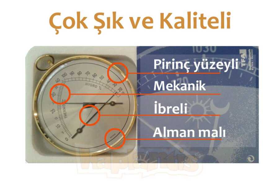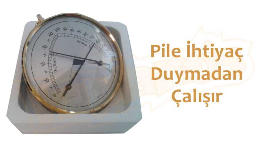Duvara asılabilir, pirinç yüzeyli, mekanik, ibreli, çok şık ve kaliteli, Alman malı termometre ve nem ölçer.