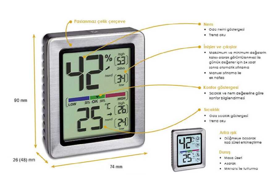 Ev ve iş yerlerine renk katacak, iç mekan ısısını izlemek için ideal bir sıcaklık ve nem ölçüm aracıdır