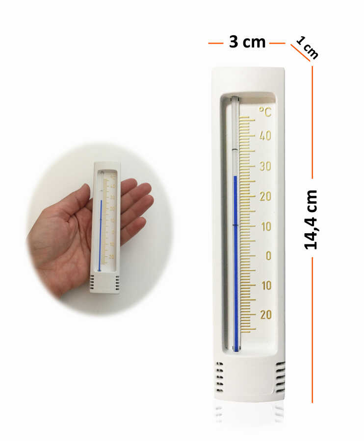 Gümüş baskılı beyaz plastikten imal edilmiş bu termometreyi duvara asarak kullanabilirsiniz.