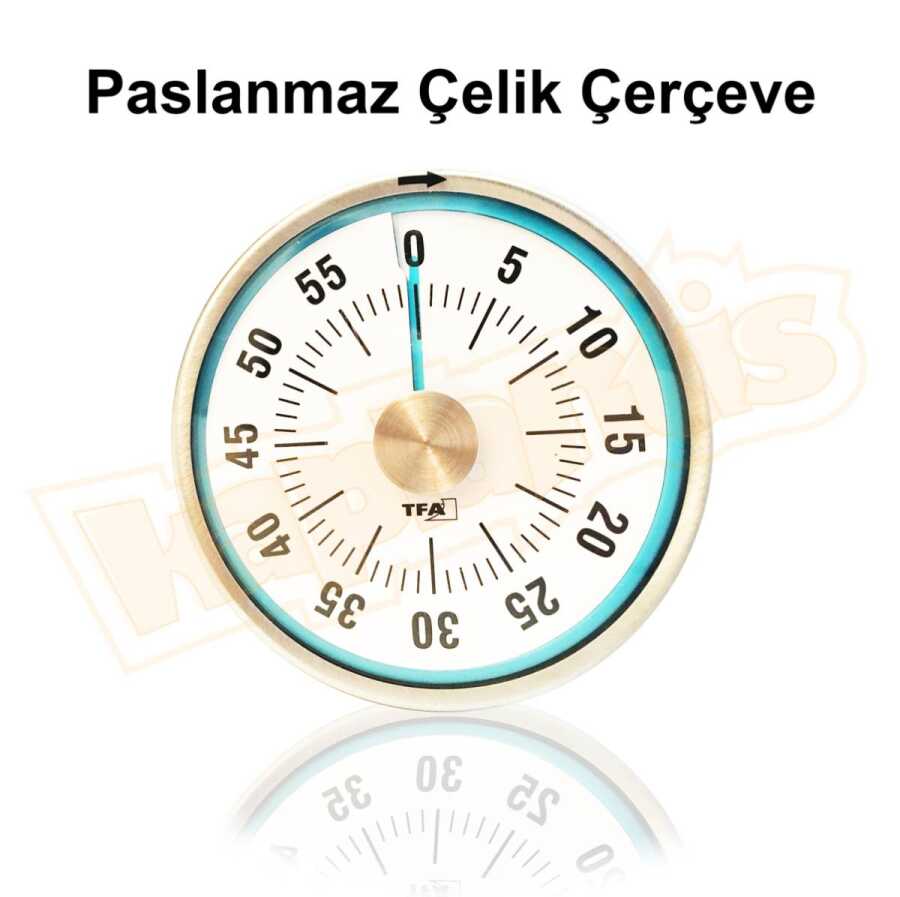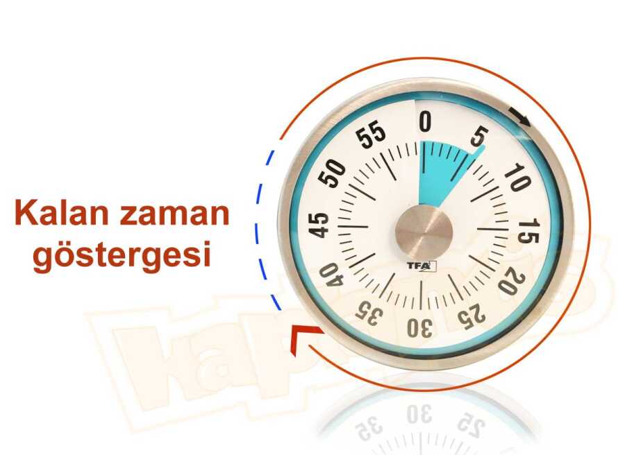 Mıknatıslı, paslanmaz çelik kurmalı mutfak zamanlayıcısı. Kalan zamanı gösteren kırmızı bölgesi ile kolay takip edilebilir, şık bir timer.