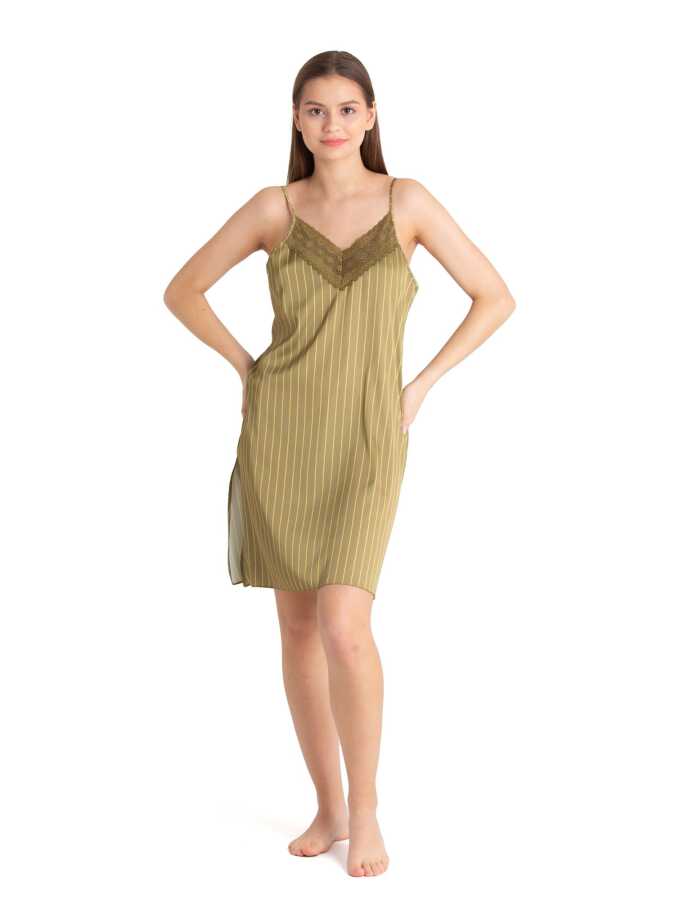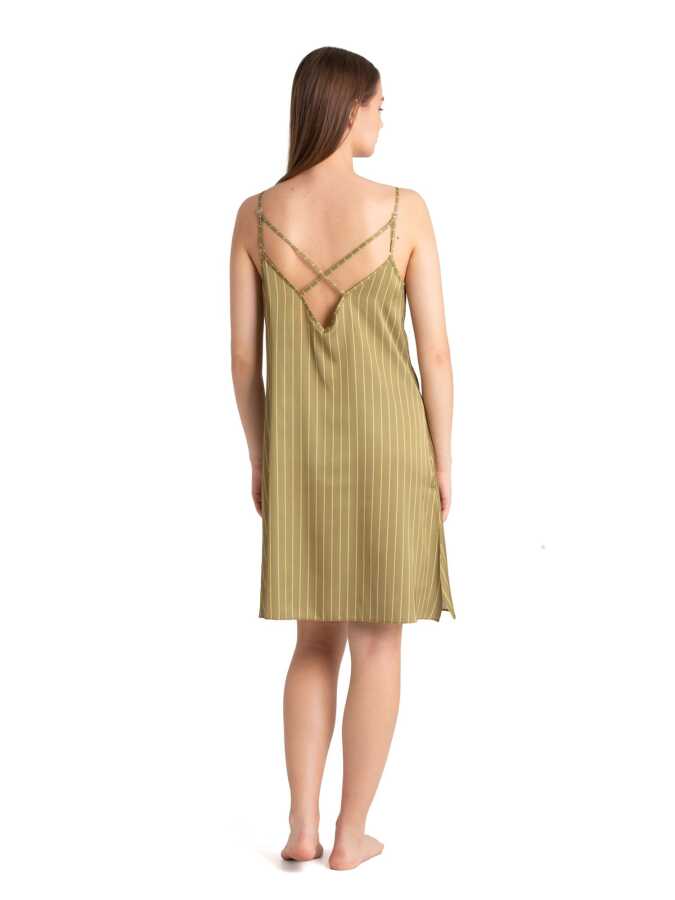Ayarlanabilir ince askılı, arkadan çapraz bantlı, yandan gizli yırtmaçlı saten gecelik