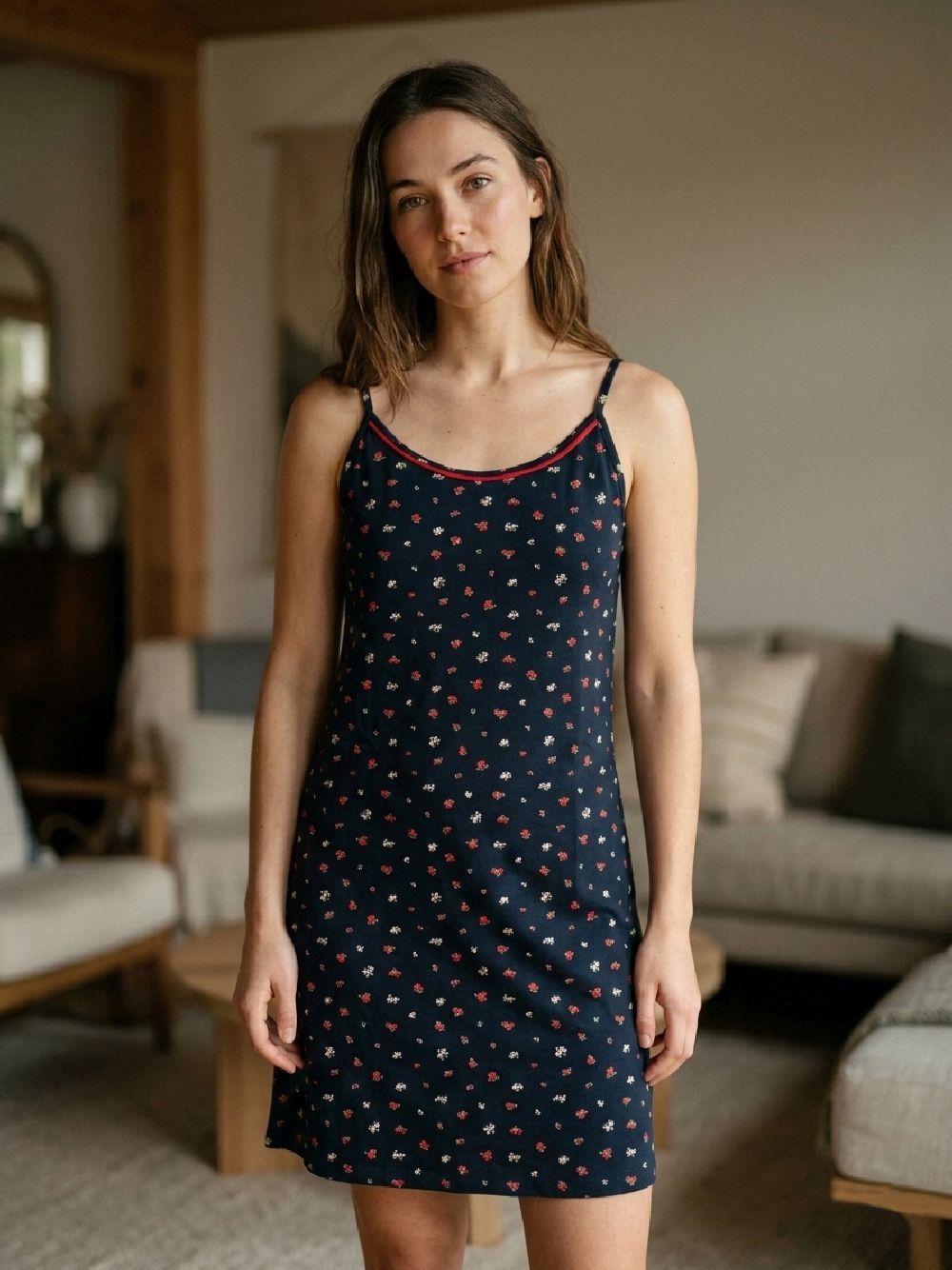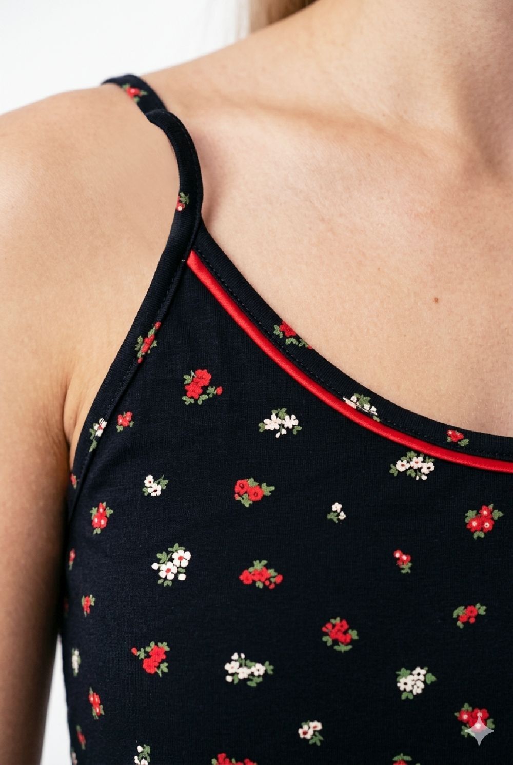 MODEL: UM26012K_R007 U&ME Midnight Bloom Mini Çiçek Desenli Kadın İp Askılı Yazlık Gecelik, yaz aylarında konforlu ve ferah bir kullanım sunmak için tasarlanmış şık bir kadın ev giyim ürünüdür. Lacivert zemin üzerinde yer alan kırmızı ve beyaz mini çiçek desenleri modele zarif ve romantik bir görünüm kazandırır. %90 pamuk ve %10 elastan karışımlı kumaşı sayesinde yumuşak, hafif ve nefes alabilen bir yapı sunar. Pamuklu dokusu cilt dostu bir kullanım sağlarken elastan içeriği esneklik kazandırarak gün boyu rahat hareket etmenize yardımcı olur. İp askılı tasarımı yaz aylarında serin bir kullanım sunarken, sırt bölümünde bulunan lastikli yapı vücuda uyum sağlayarak konforlu bir oturuş sağlar. Diz boyundaki rahat kesimi sayesinde hem gecelik hem de ev elbisesi olarak rahatlıkla kullanılabilir. Modern ve zarif tasarımıyla yaz geceleri için ideal bir pamuk kadın gecelik olan bu model, günlük ev giyiminde konfor ve şıklığı bir arada sunar. Ürün görsellerinde yer alan aksesuarlar pakete dahil değildir. Kaplantis.com güvencesiyle sunulan U&ME Midnight Bloom kadın yazlık gecelik, pamuklu yumuşak kumaşı, zarif çiçek desenleri ve rahat kesimi ile yaz gecelerinde konforlu ve şık bir kullanım sunar.Ürün Özellikleri