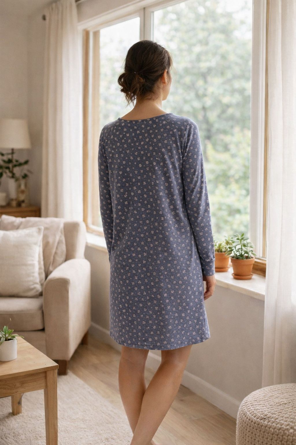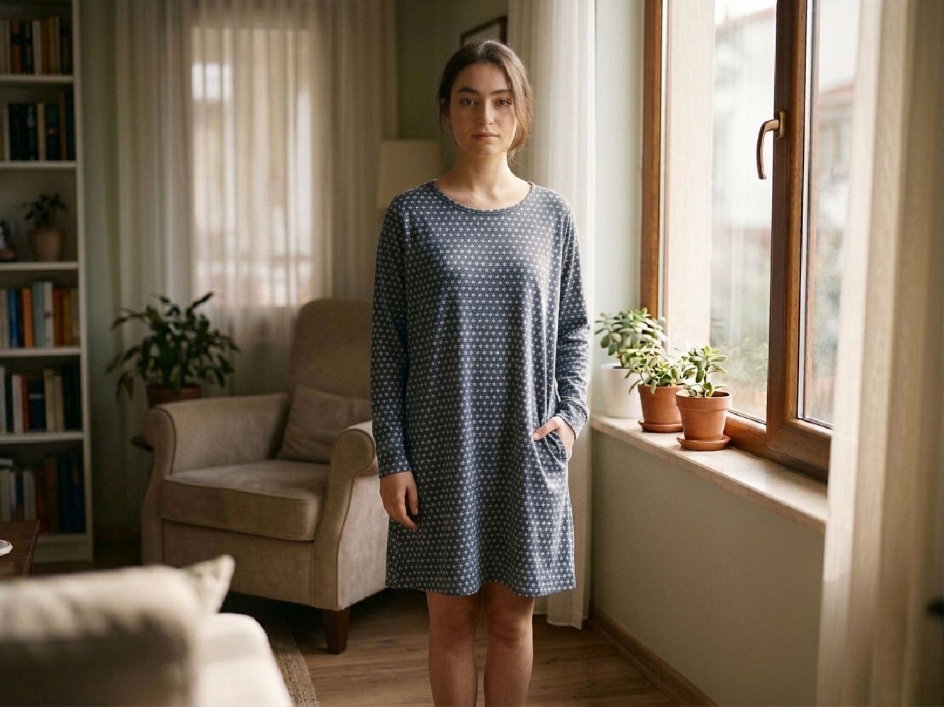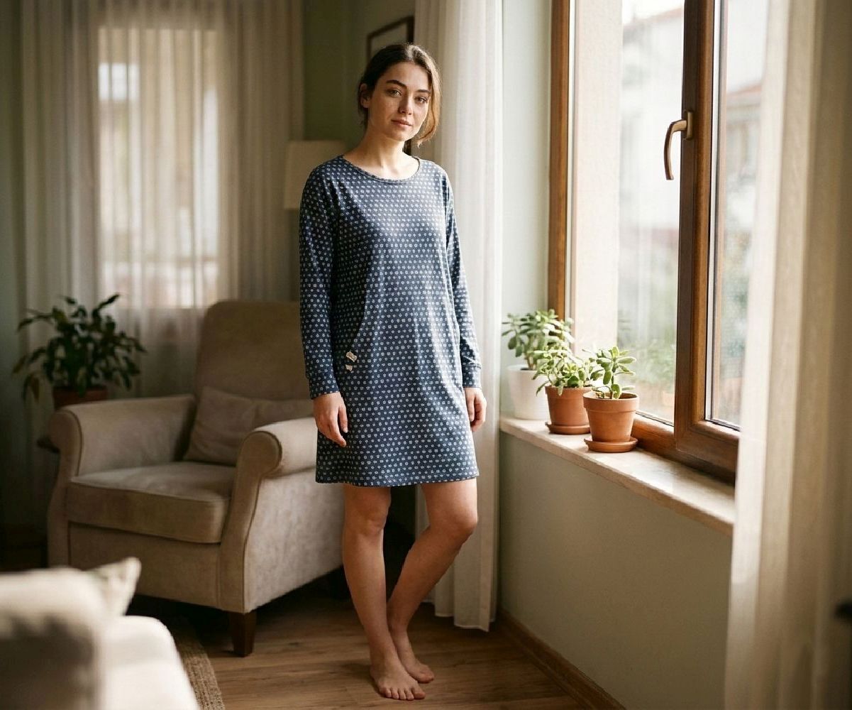 MODEL: UM250122K_R007 U&ME baykuş desenli pamuk kadın gecelik ile evde konforu keşfedin Uzun kollu, çift cepli, diz üstü rahat kesim yapısı ve %50 pamuk %50 modal yumuşak kumaşıyla günlük kullanım ve uyku için ideal U&ME Owl Baykuş Desenli Uzun Kollu Kadın Gecelik, konforu ve sevimli tasarımı bir araya getiren modern bir kadın ev giyim ürünüdür. Günlük kullanım için tasarlanan bu rahat gecelik, yumuşak kumaşı ve bol kesimi sayesinde gün boyu ve gece boyunca konforlu bir kullanım sunar. Ön kısmında bulunan çift cep detayı hem şık hem de fonksiyonel bir kullanım sağlarken, uzun ve manşetli kol tasarımı modele zarif bir görünüm kazandırır. Diz üstü boyu ve rahat kalıbı sayesinde hareket özgürlüğü sunan bu model, ev içinde rahatlıkla kullanılabilecek ideal bir gecelik alternatifidir. %50 pamuk ve %50 modal karışımlı özel kumaşı sayesinde ince, nefes alabilen ve cilt dostu bir yapı sunar. Yumuşak dokusu ciltte ipeksi bir his bırakırken, hafif yapısı sıcak havalarda ferah bir kullanım sağlar. Sevimli baykuş desenli tasarımı, eğlenceli ve modern bir stil oluştururken, rahat kesimi sayesinde günlük ev giyimi ve uyku için ideal bir tercih haline gelir. Ürün görsellerinde yer alan aksesuarlar pakete dahil değildir. Kaplantis.com güvencesiyle sunulan U&ME baykuş desenli pamuk kadın gecelik, yumuşak kumaşı, rahat kalıbı ve şık tasarımı ile ev giyiminde konfor ve stil arayan kadınlar için ideal bir tercihtir.Ürün Özellikleri