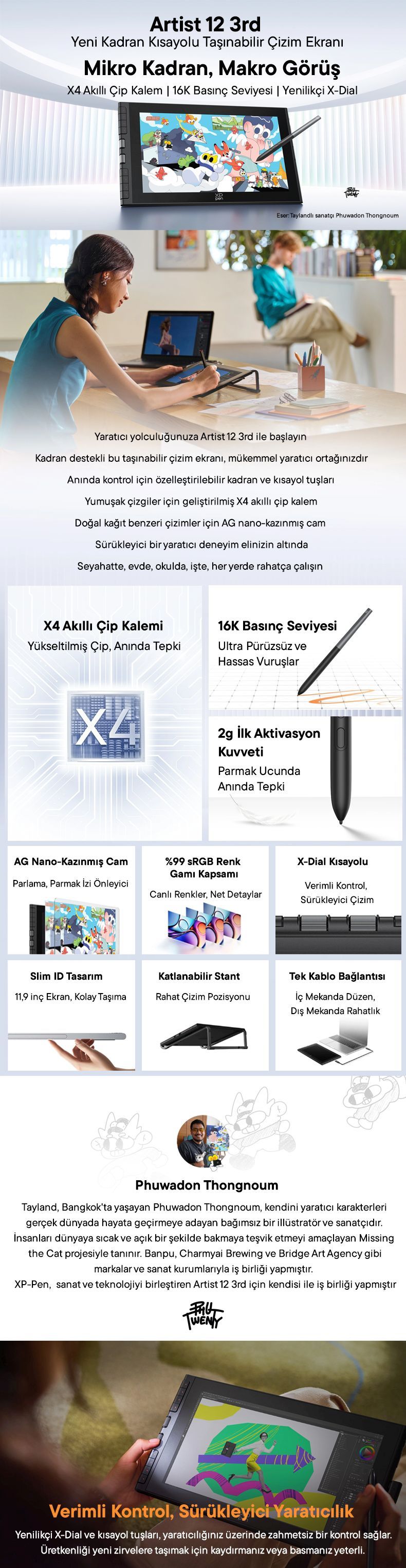 Kafe gibi dış mekanlarda çizim yapmayı seven dijital sanatçılar ya da dersler arasında bu tableti kalemle taşıyan öğrenciler için idealdir