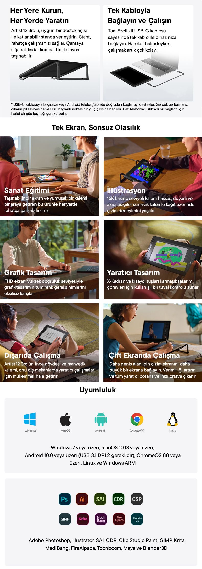 Çok yönlü 3'ü 1 arada çoklu arayüz, çeşitli bilgisayar modelleriyle uyumluluk sağlar. Ürünle birlikte verilen katlanabilir çizim tableti standı, ergonomik çizim için rahat 20 derecelik bir açı sağlayarak uzun yaratıcı oturumlar sırasında boyun ağrısını azaltır.