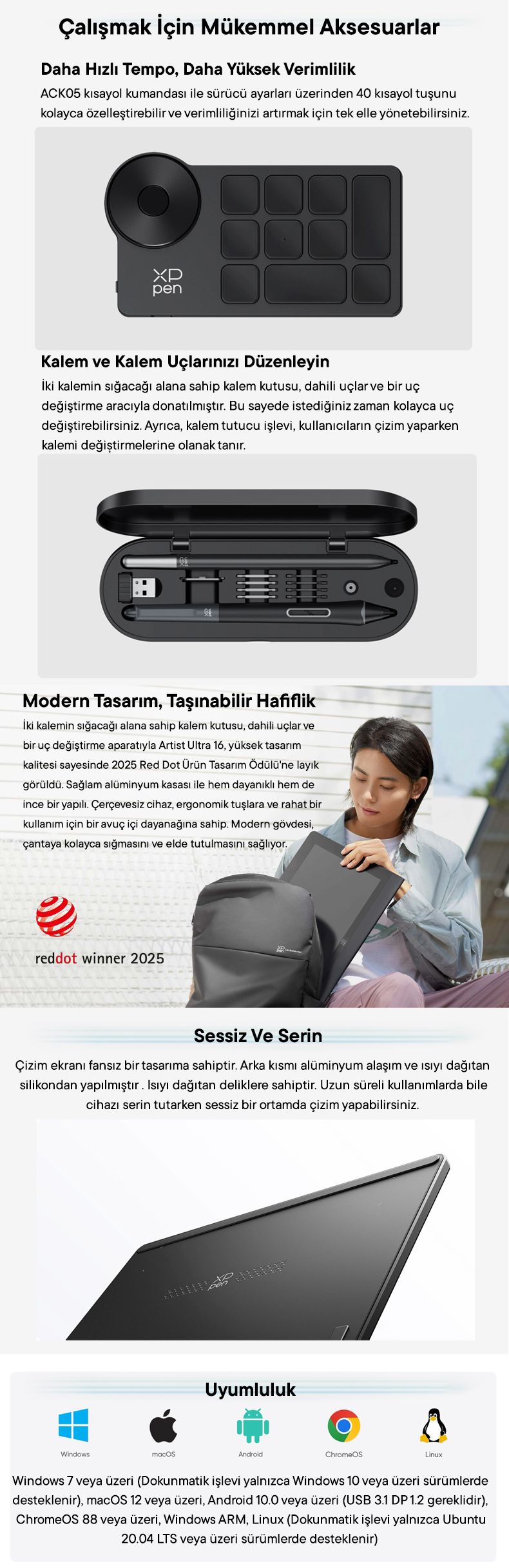 Uyumluluk: Windows 7 veya üzeri (Dokunmatik işlevi yalnızca Windows 10 veya üzeri sürümlerde desteklenir), macOS 12 veya üzeri, Android 10.0 veya üzeri (USB3.1 DP1.2 gereklidir), ChromeOS 88 veya üzeri, Windows ARM, Linux (Dokunmatik işlevi yalnızca Ubuntu 20.04 LTS veya üzeri sürümlerde desteklenir)